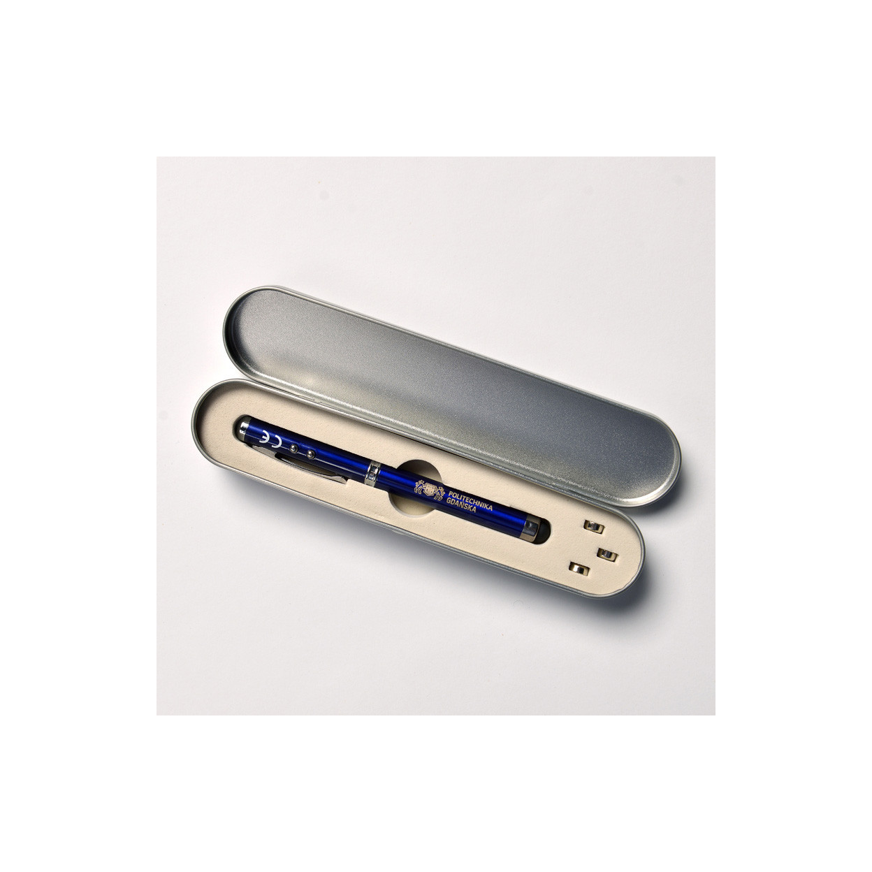 equipped with buttons to switch on the laser pointer and to turn on the flashlight