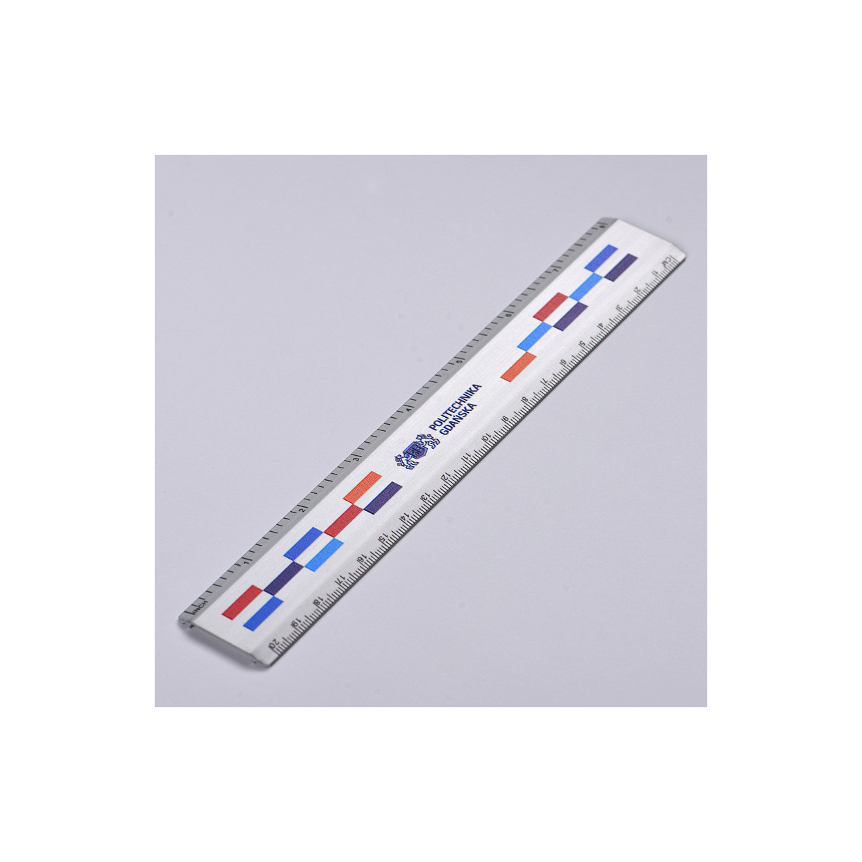 grawerowane logo Politechniki Gdańskiej na kolorowym pasku